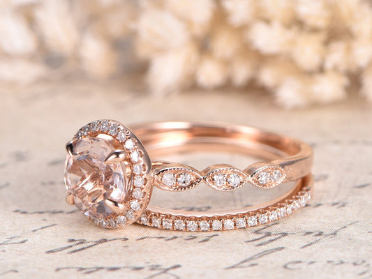 7mm Round Cut Morganite Engagement Ring Set 2pcs Diamond Halo Art Deco Band | Thin Matching Band