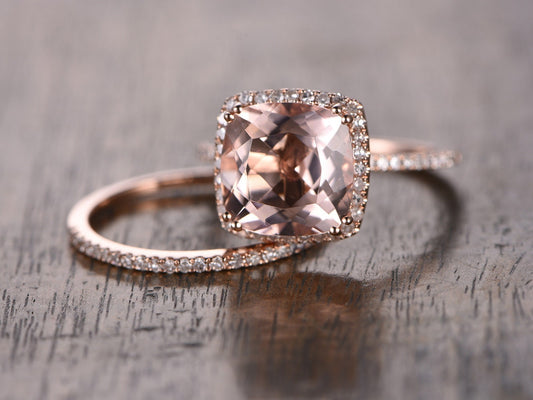9mm Cushion Pink Morganite Ring Set 2pcs 14K Rose Gold Morganite Engagement Ring Diamond Bridal Ring Set Morganite Ring