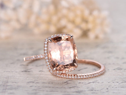 10x12mm Cushion Cut Morganite Engagement Ring Set 2pcs 14K Rose Gold Half Eternity Diamond