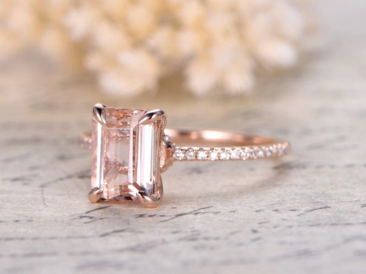 6x8mm Emerald Cut Morganite Engagement Ring 14K Rose Gold Solitaire Diamond Half Eternity