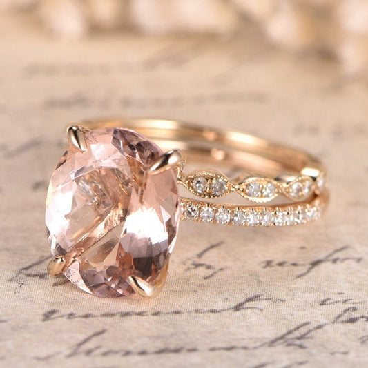 10x12 Oval Cut Morganite Engagement Ring Set 2pcs 14K Rose Gold Diamond Art Deco Band Solitaire